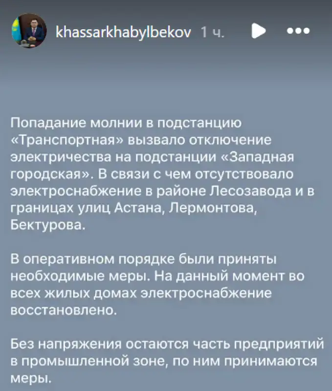 "Попадание молнии в подстанцию "Транспортаная" вызвало отключение электричества на подстанции "Западная городская". В связи с чем отсутствовало электроснабжение в районе Лесозавода и в границах улиц Астана, Лермонтова, Бектурова", - написал он.