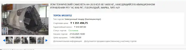 На торгах был продан технический лом самолета АН-26, передает корреспондент Tengrinews.kz.