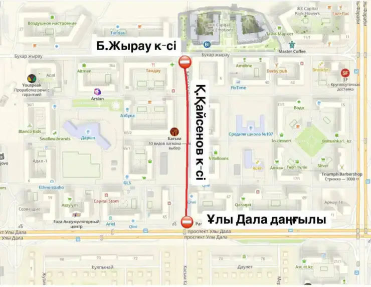 - улица Кайсенова - от улицы Бухар Жырау до проспекта Тауелсиздик. Движение закрыто с 20 апреля по 20 августа. Объезд организован через внутриквартальные проезды;