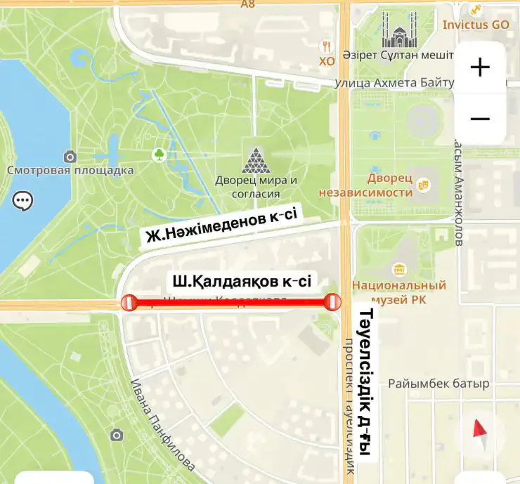 - улица Калдаякова на участке от проспекта Тауелсиздик до улицы Нажимеденова. Движение будет перекрыто с 14 по 25 мая;