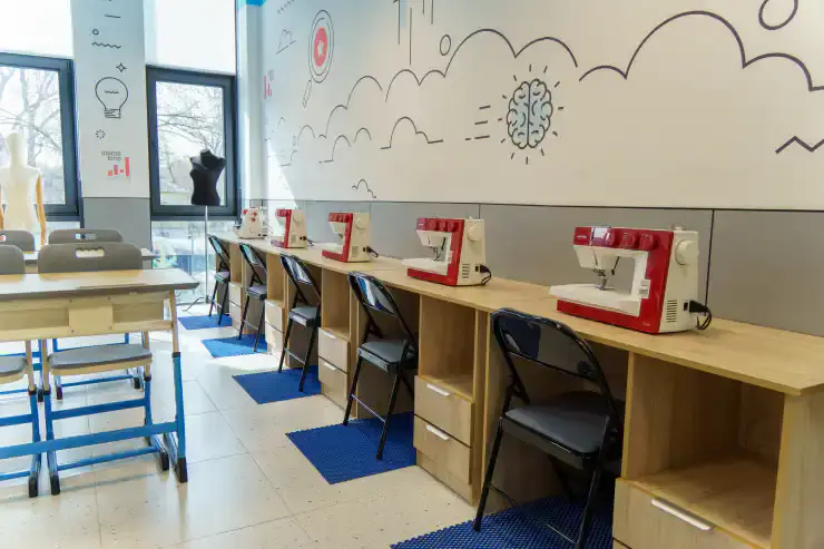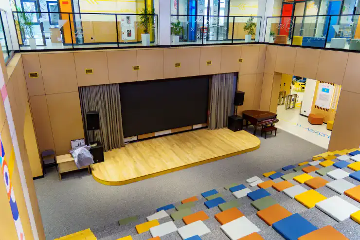 Амфитеатр предназначен для проведения творческих вечеров, встреч с наставниками, дискуссий и мастер-классов. Зал спроектирован без традиционной сцены: идея заключается в том, чтобы стереть границы между зрителем и участником. Для изучения цифровой грамотности в кабинетах установлены современные моноблоки, ноутбуки и интерактивные панели. В классах робототехники дети программируют, создают свои первые модели и осваивают базовые принципы инженерии. В центре также оборудована швейная мастерская, арт-студии, залы для занятий музыкой и шахматами.