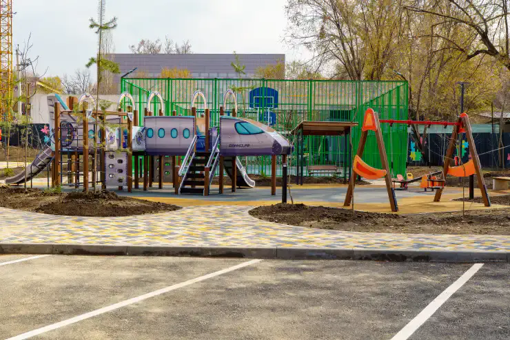 Кроме того, преобразилось и пространство вокруг учреждения: теперь здесь есть удобная парковка для родителей, баскетбольная площадка, детская игровая зона, открытый корт, уютные беседки, лавочки для отдыха. По периметру высажены ели и туи, придающие двору ухоженный и живой облик.