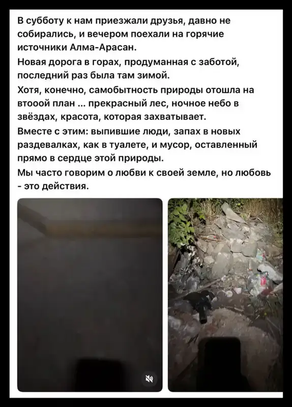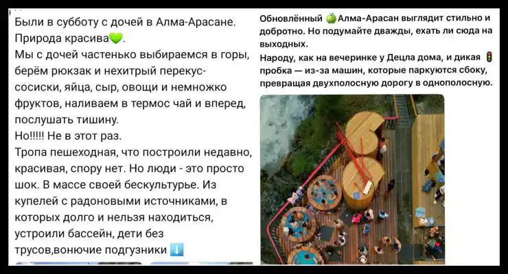 Одна из девушек, посетившая Алма-Арасан, поделилась своим негативным опытом. Она отметила, что, несмотря на красоту горного леса и новую дорогу, впечатление от отдыха испортил мусор, неприятный запах в раздевалках и шумные компании. "В субботу к нам приезжали друзья, мы давно не собирались, вечером отправились на горячие источники Алма-Арасан. Новая дорога в горах продумана с заботой. Последний раз я была там зимой. Но, к сожалению, самобытная красота природы отошла на второй план - прекрасный лес, ночное небо в звёздах. Вместе с этим - выпившие люди, запах в новых раздевалках, как в туалете, и мусор, оставленный прямо в сердце этой природы. Мы часто говорим о любви к своей земле, но любовь - это действия", - написала она.
