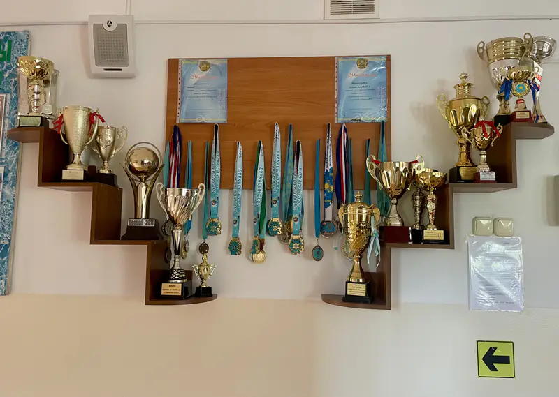 Полка с медалями и кубками, выигранными учениками школы на районных и областных спортивных соревнованиях. Фото: ©️ Анастасия Маркова