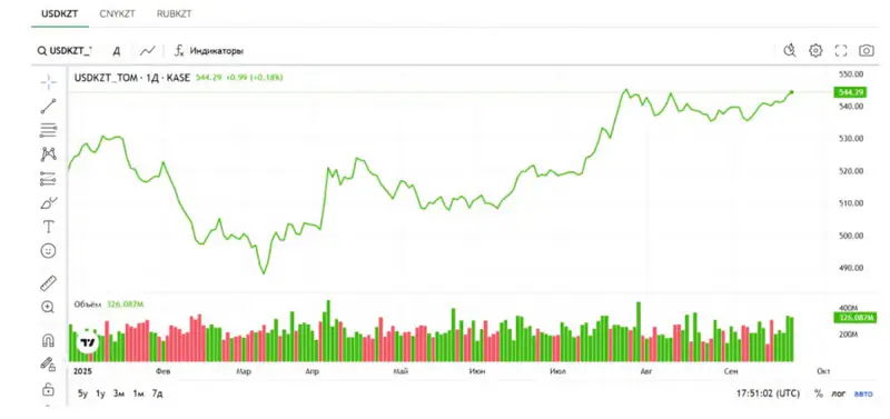 На Казахстанской фондовой бирже (KASE) по итогам торгов на 17:00 по времени Астаны средневзвешенный курс доллара составил 544,91 тенге, увеличившись на 1,98 тенге. Официальный курс Национального банка на 23 сентября составляет 542,67 тенге за доллар.