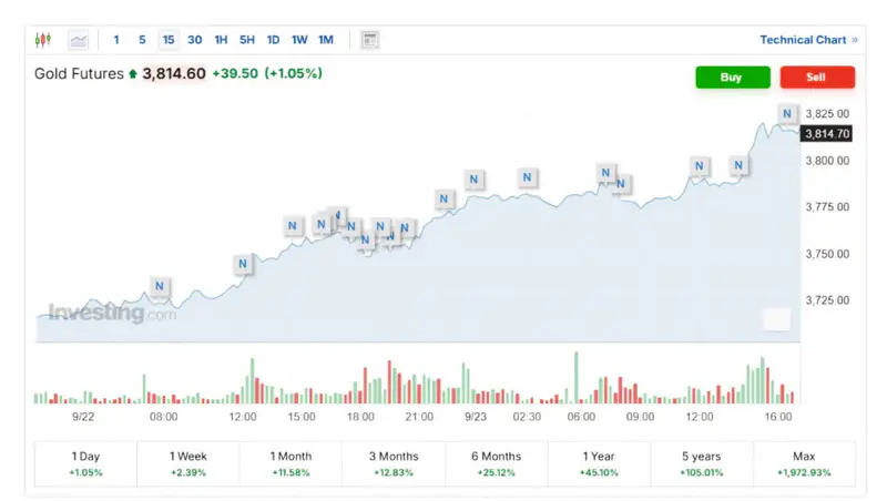 Золото обновило максимумы, так как инвесторы ищут безопасные активы на фоне экономической неопределенности и осторожных сигналов ФРС о будущих ставках. Фьючерс на золото повысился на 1,05 процента, достигнув 3 814,60 доллара за унцию.