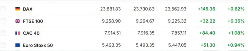Европейские рынки показали положительную динамику, чему способствовал оптимизм инвесторов после рекордных уровней на американских рынках и ожидания снижения процентных ставок ФРС США. Основные индексы, такие как DAX (+0,62 процента, Германия), CAC 40 (+1,08 процента, Франция) и Euro Stoxx 50 (+0,94 процента), а также FTSE 100 (+0,35 процента, Великобритания) перешли в рост.