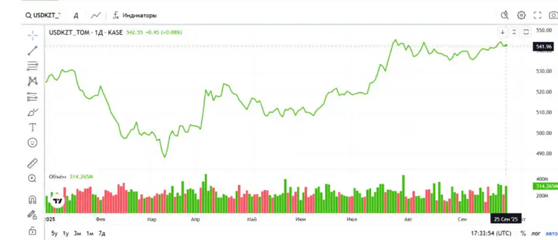 По итогам торгов на Казахстанской фондовой бирже (KASE, на 17:00 по времени Астаны) средневзвешенный курс доллара составил 541,81 тенге, понизившись на 0,79 тенге. Официальный курс Национального банка на 25 сентября составляет 542,8 тенге за доллар.