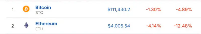 Курс Bitcoin (BTC) подешевел на 1,30 процента, Ethereum (ETH) - на 4,14 процента до 4 005,54 доллара за одну монету. Падение связано с активными продажами крупными инвесторами и макроэкономической неопределенностью.