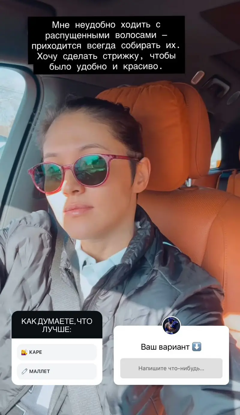 "Мне неудобно ходить с распущенными волосами - приходится всегда собирать их. Хочу сделать стрижку, чтобы было удобно и красиво. Как думаете, что лучше: каре или маллет?" - пишет Кызайбай в соцсетях.
