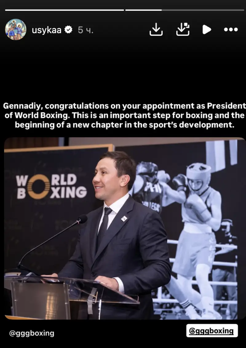 "Геннадий, поздравляю с вашим назначением на роль президента World Boxing. Это важный шаг для бокса и начало новой главы в развитии этого вида спорта", - написал Усик.