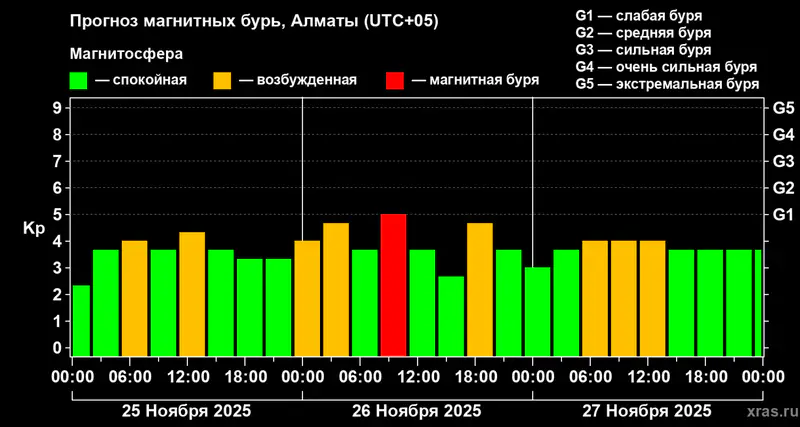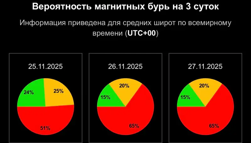 По прогнозам учёных, 26 ноября с 6:00 до 12:00 ожидается магнитное возмущение уровня G1. На четверг буря не прогнозируется, однако вероятность геомагнитных колебаний составляет 65 процентов. Риск небольших возмущений равен 20 процентов, а спокойной обстановки — всего 15 процентов.
