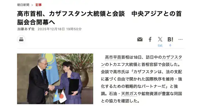 Национальные газеты Asahi Shimbun и Mainichi Shimbun рассматривают визит Токаева в контексте региональной политики. В их материалах переговоры в Токио связываются с подготовкой первого в истории саммита Японии и стран Центральной Азии, где Казахстан выступает ключевой страной.