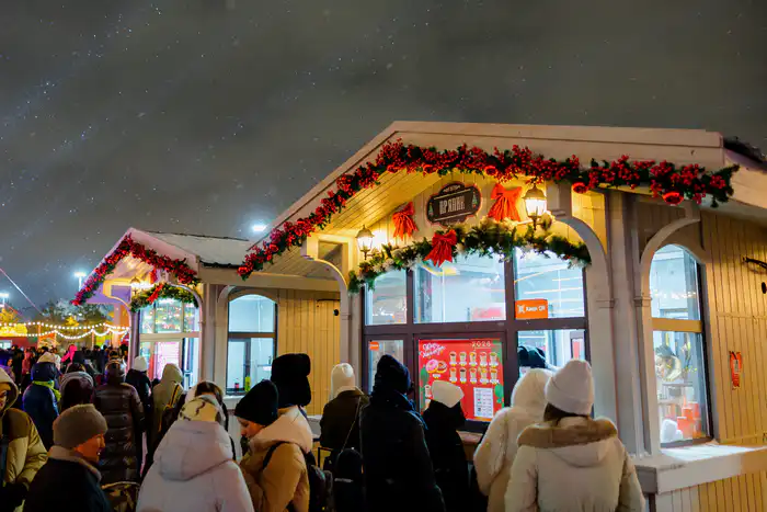 Фуд-корты расположены в центральной части городка и представляют собой теплые закрытые зоны, где можно отдохнуть и насладиться горячими напитками и традиционными зимними угощениями.