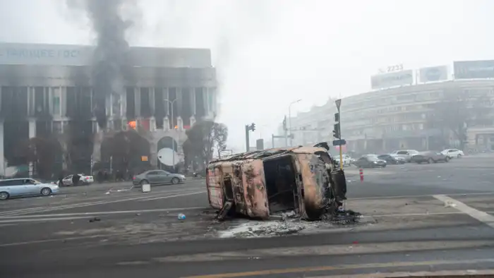 4 января мирные митинги в Алматы переросли в беспорядки. Президент призвал к благоразумию, и в нескольких городах был введён режим чрезвычайного положения.