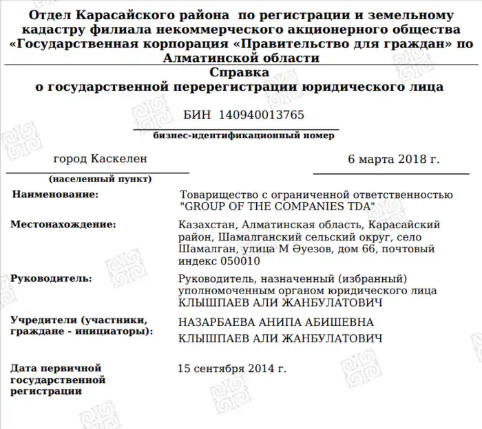 - ТОО GROUP OF THE COMPANIES TDA – Али Клышпаев, Анипа Назарбаева – 92,3 миллиарда тенге;