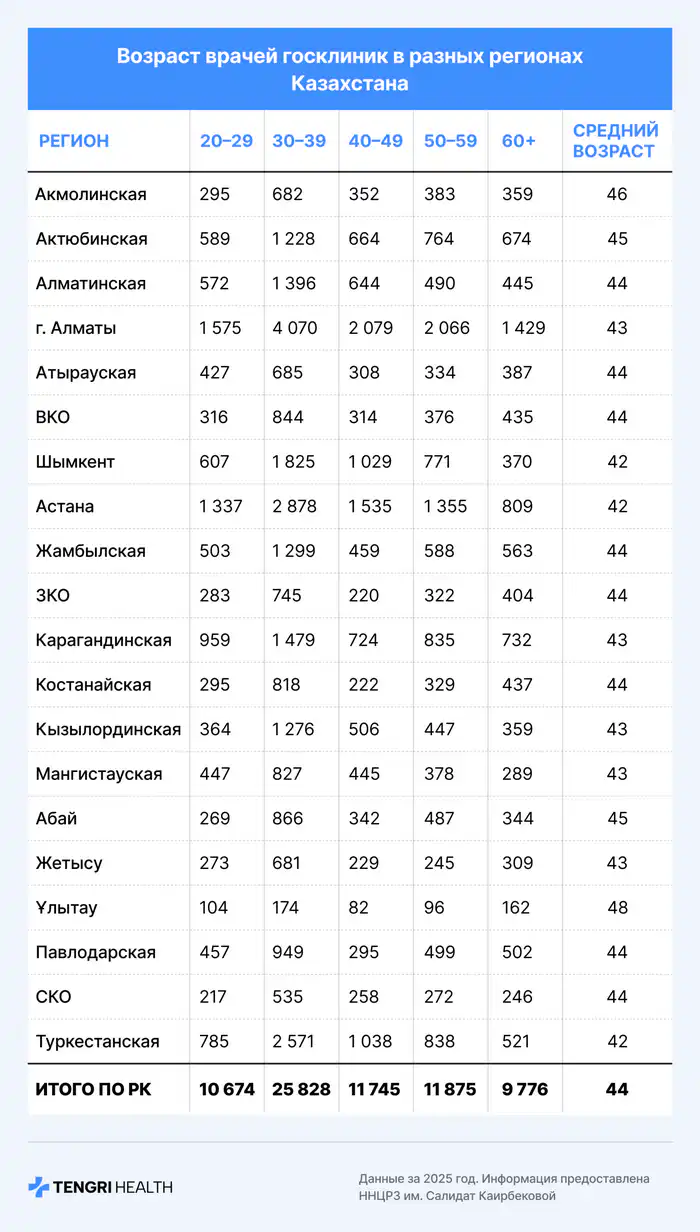 Средний возраст врачей в Казахстане колеблется от 42 лет в Туркестанской области, Шымкенте и Астане до 48 лет в Улытау. В среднем по стране этот показатель составляет 44 года.