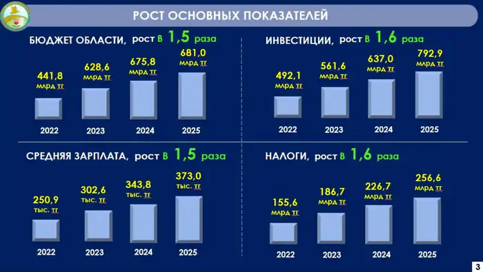 "За последние три года в регионе значительно выросли базовые экономические показатели. Областной бюджет и средняя заработная плата увеличились в 1,5 раза, инвестиции в основной капитал — в 1,6 раза. Объём прямых иностранных инвестиций за этот период составил 1,5 миллиарда долларов, а налоговые поступления выросли до 256,6 миллиарда тенге", — отметил аким области.