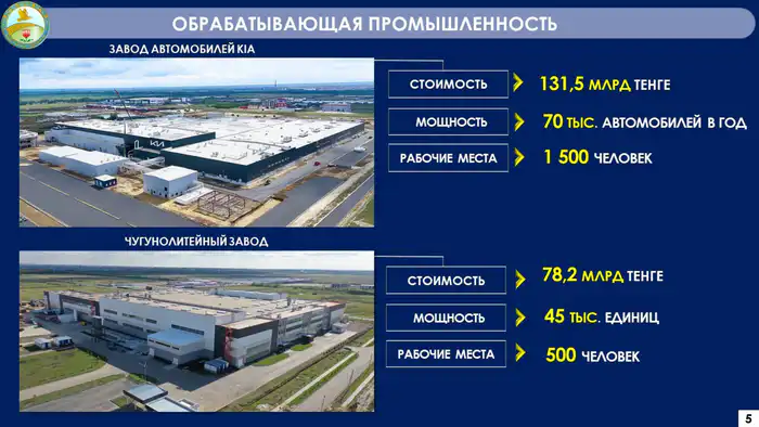 Объём промышленного производства в регионе за год достиг 3,5 триллиона тенге. Реализовано семь инвестиционных проектов на сумму 322,1 миллиарда тенге, создано 3,3 тысячи рабочих мест.
