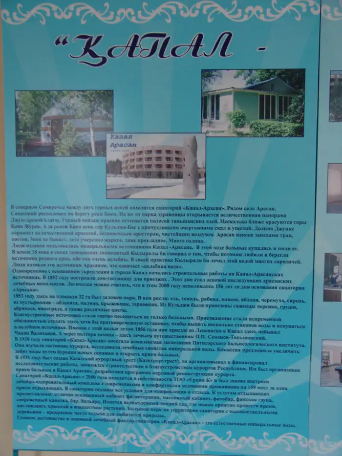 "Огромный вклад в восстановлении курорта сыграл казахстанский ученый-медик Сергей Замятин, посвятивший 30 лет своей жизни его изучению и благоустройству. Отмечалось, что на этой территории имеются большие запасы минеральной воды и прекрасные климатические условия. В 1949 и 1959 годах курорт значительно обновили и впоследствии перевели на круглогодичную работу, включая открытие воздушного маршрута Капал-Арасан - Алматы", - рассказали в районном акимате.