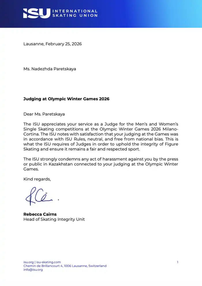 "ISU с удовлетворением отмечает, что ваше судейство на Играх было в соответствии с правилами ISU, нейтральным и свободным от национальной предвзятости. Это то, чего ISU требует от судей, чтобы поддерживать целостность фигурного катания на коньках и обеспечение того, чтобы оно оставалось честным и уважаемым видом спорта.ISU решительно осуждает любые акты преследования в отношении вас со стороны прессы или общественности в Казахстане, связанные с вашим судейством на зимних Олимпийских играх", - говорится в письме, опубликованном на сайте КФФК.