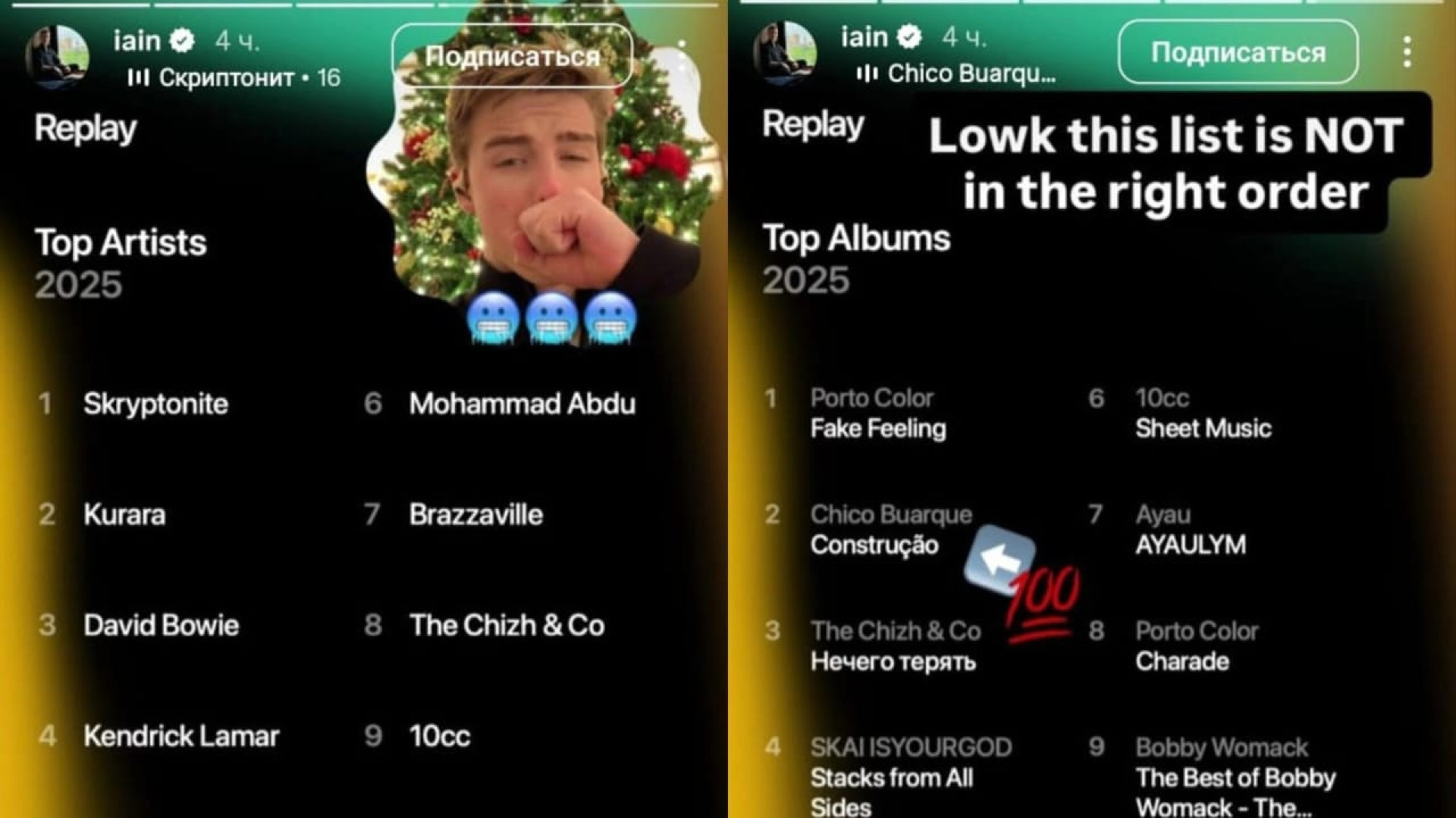 А в конце 2025 года актер поделился своим музыкальным топом за 2025 год. В список любимых исполнителей вошли и казахстанские артисты: Скриптонит занял первое место, а на седьмом месте оказался альбом казахстанской певицы Ayau под названием AYAULYM. В рейтинге самых прослушиваемых композиций артиста также можно было заметить песни группы "Дос-Мукасан".