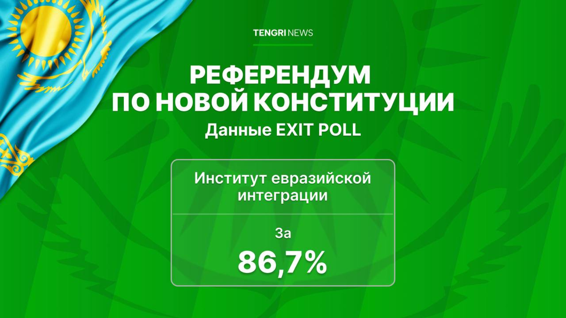 Согласно экзитполу Института евразийской интеграции, 86,7 процента из 30 тысяч опрошенных граждан поддержали принятие новой Конституции. Явка составила 75,3 процента, с погрешностью ±1 процент.