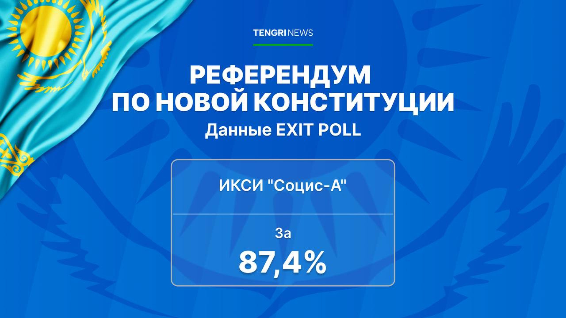 По данным опроса Института комплексных социальных исследований – Астана "Социс-А", 87,4 процента респондентов также поддержали новую Конституцию, при явке 73,8 процента и погрешностью ±1,5 процента.