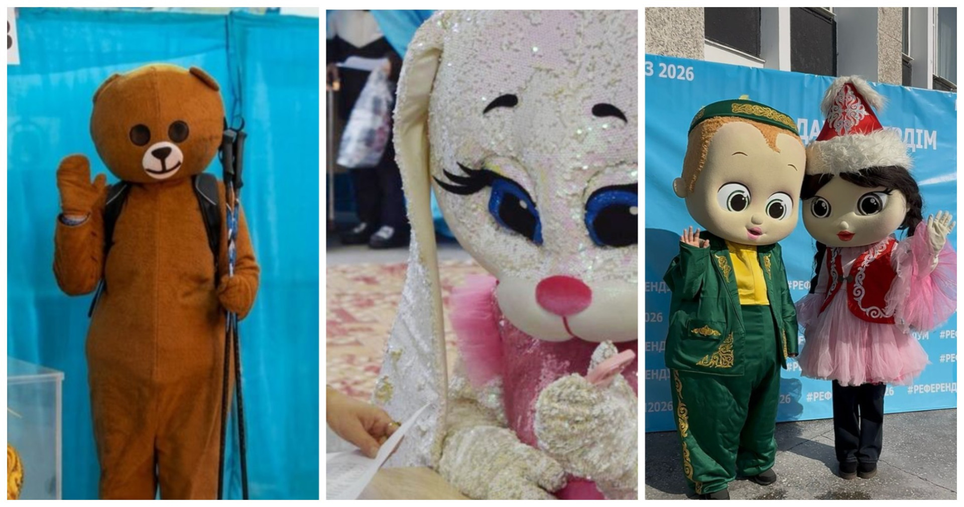 В Восточном Казахстане за атмосферу отвечали медведь, заяц и другие сказочные персонажи. Как разумно подметили наши корреспонденты в онлайн-трансляции с референдума: "Долг — дело общее".