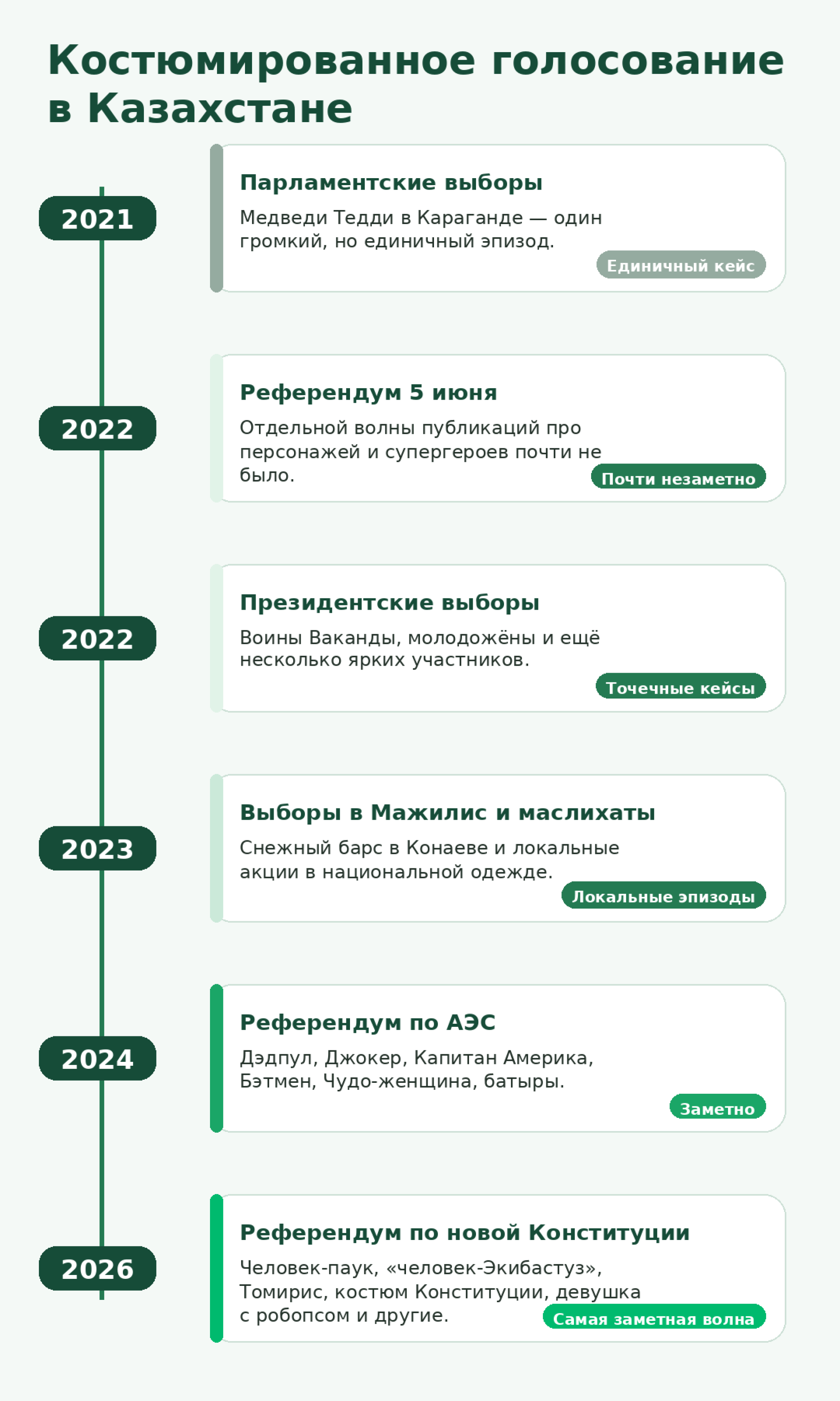 На выборах в Мажилис и маслихаты 19 марта 2023 года такие случаи стали заметнее: "снежный барс" в Конаеве и акция жителей села Баянды, которые массово пришли в национальной одежде. Но всё же их можно охарактеризовать как локальные инфоповоды, а не общереспубликанский поток образов.