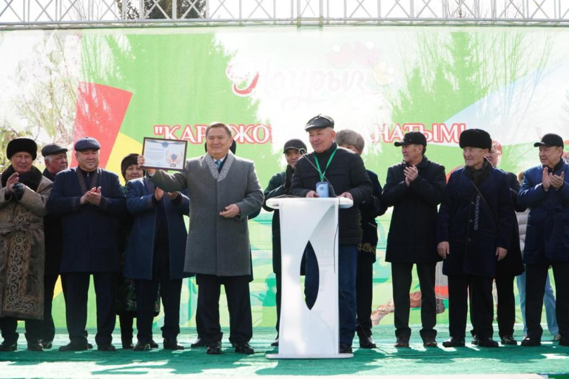 Глава региона также продемонстрировал диплом, который, хотя и неясно, что именно он символизирует, был отмечен как важный. В рамках празднования также прошли конкурсы и выступления артистов, акиму показали беркута.
