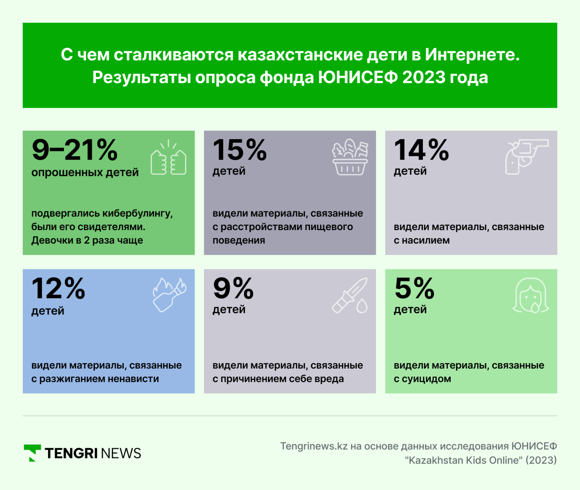 ЮНИСЕФ отмечает, что происходит это из-за того, что родители в Казахстане системно недооценивают интернет-угрозы. Большинство опрошенных взрослых считают маловероятным, что их ребёнок столкнётся с чем-то тревожным в ближайшие три месяца.
